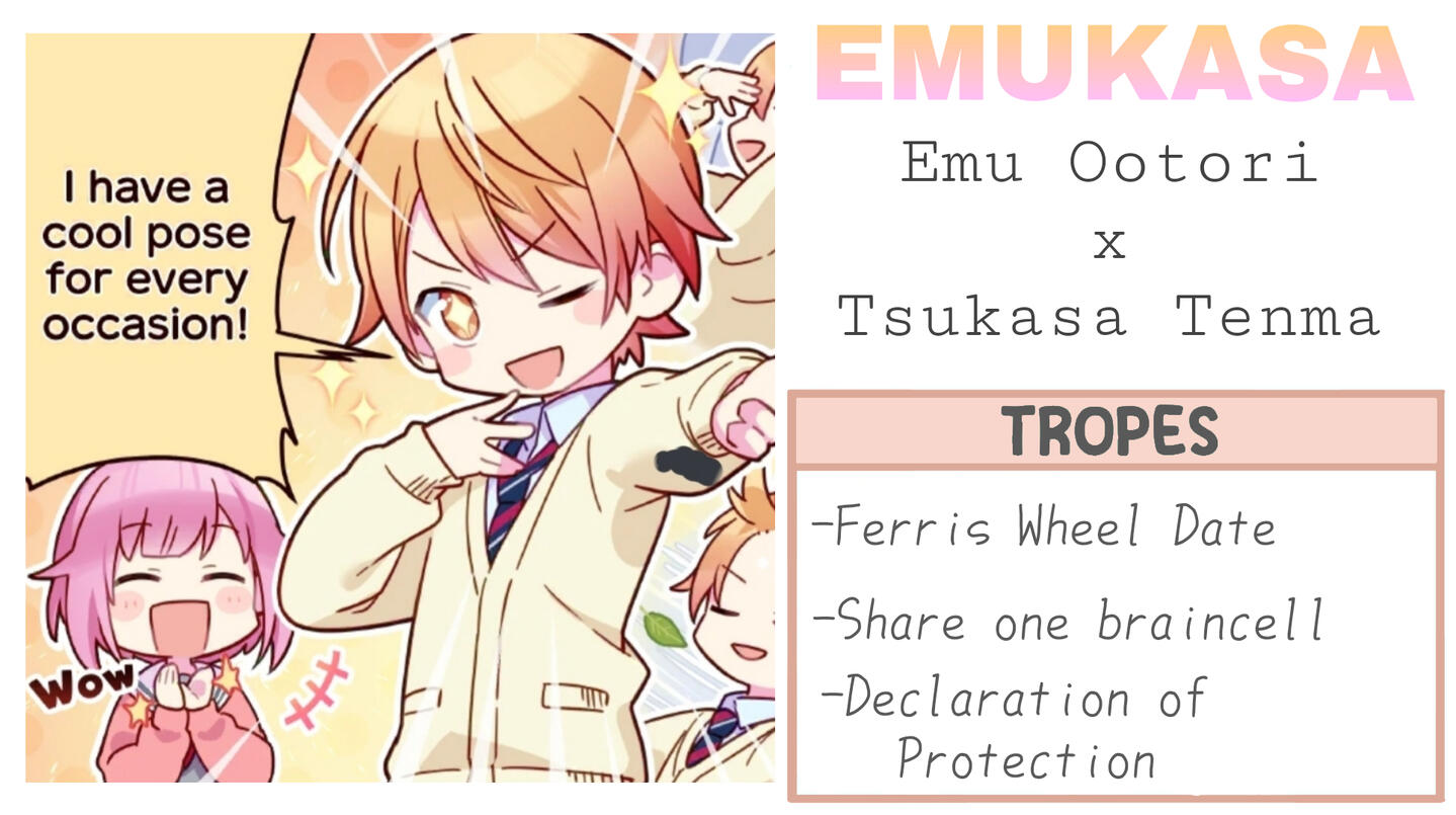 Emu dijo sentir una sensación cuando vió a Tsukasa por primera vez. Emu también está determinada en Tsukasa es una estrella y en que pueden hacer grandes shows juntos, y no le dejó ir para nada. Más adelante en la historia Emu le pide ir a la noria juntos, para explicarle la historia del Wonder Stage. (Realmente casi lloro ahí)